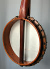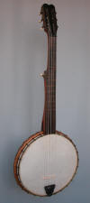 This is a late English minstrel with flushfrets. It was originaly made for 7 strings. The 12" rim is quite thin with an interesting screwed on shoeband. Its 24 1/2" scale makes him very easy to play. I guess it could be dated from the late 70's or early 80's.