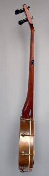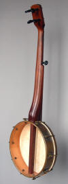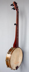 Just a very simple old banjo with square shoes and flush frets. Nylon strings, calfskin head.